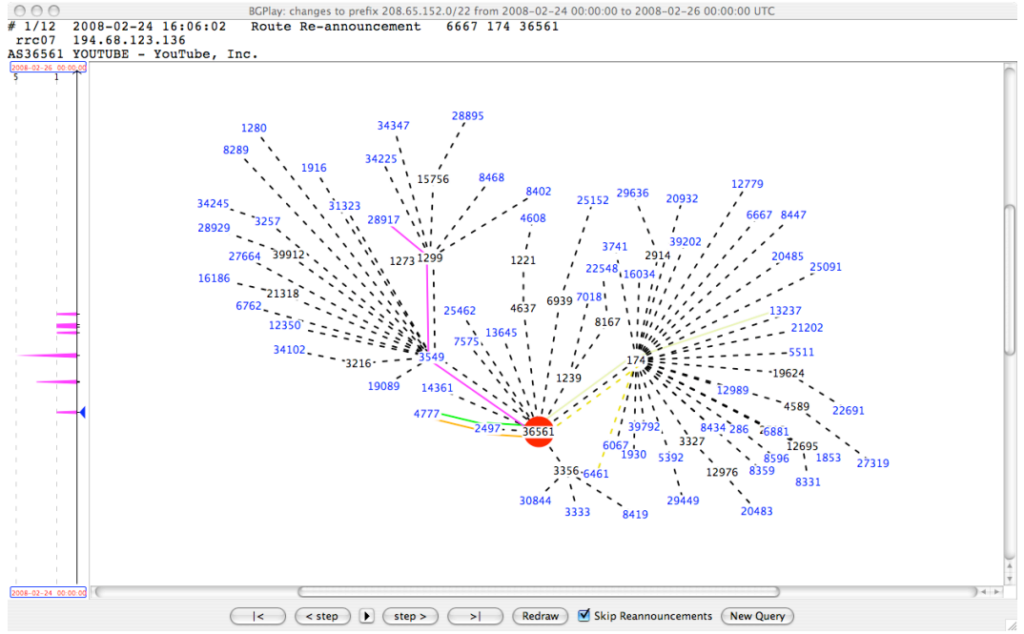 短短三分钟内,全球大部分 YouTube 流量都被导向了巴基斯坦。YouTube 在全球范围内瘫痪了大约两个小时,直到 PCCW 手动撤回了这条路由才恢复。